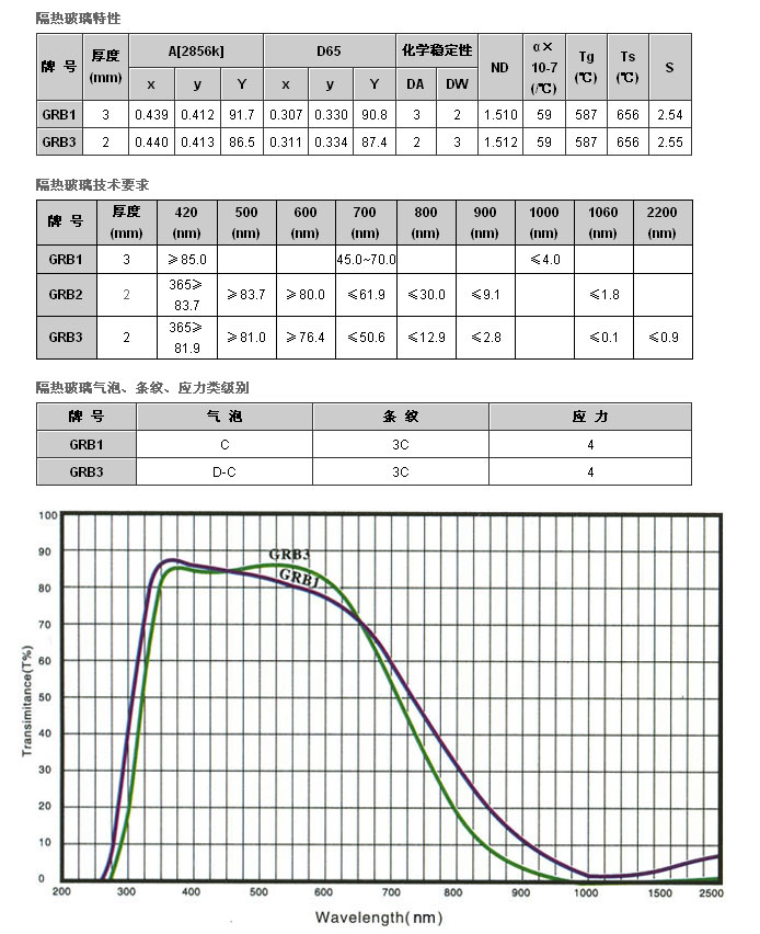 隔热玻璃可分为XRB1,XRB3,镀膜隔热玻璃三种,三种玻璃是略带蓝绿色接近于无色的玻璃。其中XRB1是磷酸盐吸收玻璃;XRB3是硅酸盐吸收玻璃;镀膜隔热玻璃是隔热纳米粉体阻隔热量。它们不显著的吸收可见光线而是吸收大量产生热量的近红外光线,其中XRB1,XRB3在需要光线强度高的而又需要隔除热量的情况下性能特点最为明显。